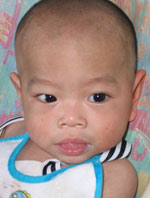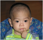 Jacob was born on January 9, 2005. The next evening, cold and malnourished, he was found outside of the gate of one of the local orphanages. The police completed an unsuccessful search for his parents and he was soon under the care of the local orphanage. Soon after he arrived in the orphanage, he was diagnosed with having PDA, which is a heart disease. A little while before we were able to bring him home, he was hospitalized for pneumonia and heart infection. He was able to recover quickly and is now building up his strength. Jacob is a charming little boy. He has big eyes that quickly take in everything that is going on around him. He enjoys interacting with people and being the center of attention. He is currently able to crawl and is working on his standing abilities. Jacob is a beautiful young man. We look forward to watching him continue to develop and grow.