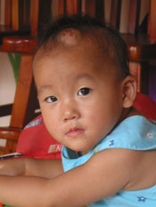 ˇˇˇˇKyla's Chinese name means, "Spring Song". She came to us on June 9, 2003. Kyla is very strong for her age and is a people person. She likes to talk in baby language to her caregivers. Kyla is a very alert and happy child with a beautiful smile. She has a Strawberry Hemangioma tumor on the top of her head that will absorb itself by the time she is two or three years old. Kyla is a wonderful addition to our family.