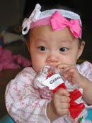 Gracie was born on March 10, 2008. She was abandoned the same day on a local street. After being unable to locate her parents, the police took her to the orphanage. She was diagnosed with heart disease (VSD), and due to this condition, she is quite weak and small. However, she is a very smart little girl, and she's already winning hearts. All it took is one train ride from her hometown to Beijing for us to grow quite attached! We're thankful Gracie has joined our family, and we can't wait to watch her grow.