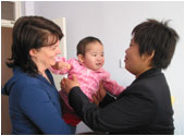 Lydia being given to her foster mother by Karen, the foster home director. |