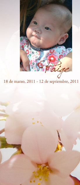 Pequeña y dulce Paige... ¡cuánto te echamos de menos!. ¡Estamos tan agradecidos de haber recibido el regalo de conocerte!. Aunque no logramos tenerte entre nosotros todo el tiempo que nos habría gustado, atesoramos cada maravilloso momento que hemos pasado en tu compañía. Cada sonrisa. Cada carcajada. Cada vistazo para verte dormir. Fuiste profundamente amada, y te echamos profundamente de menos. Pero descansamos sabiendo que tu vida, aunque muy corta, fue muy rica. Porque nos trajiste mucha alegría... tu espíritu alegre y tu sonrisa radiante trajo paz a todo el que te conoció.