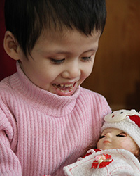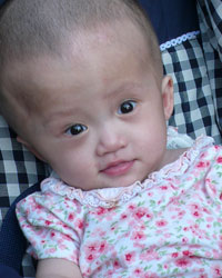 Rosie was born on September 28, 2008. She was abandoned the same day, and the person who found her took her to the local orphanage with the local policemen. Orphanage doctors diagnosed her with neurological issues, and we brought her to Beijing for surgery on April 9, 2009. Rosie is a beautiful little girl with gorgeous dark hair and deep eyes. She is peaceful and quiet, loves to wander and feels most comfortable around people she knows. Rosie has a gentle spirit and loves her caretakers and baby dolls very much.