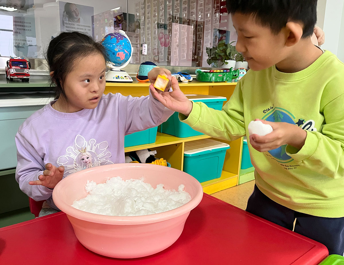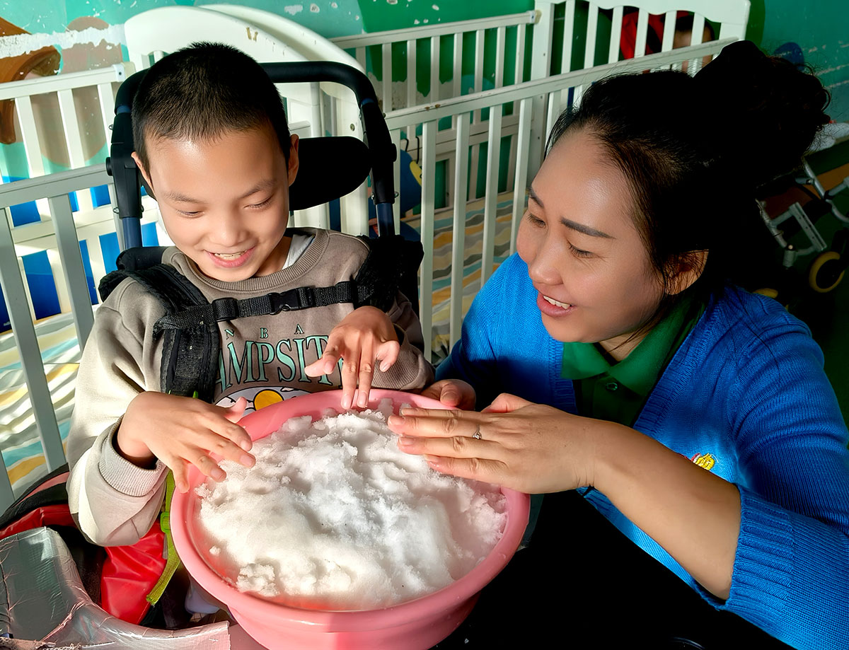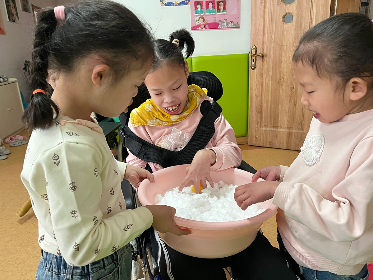 Some of the kids stayed inside, but that didn’t stop them from enjoying the snow. A basin filled with snow was brought in so everyone could feel and play with it. Amelia and Cindy were so sweet as they held the basin before Ruth and let her play first. The smiles on their faces melted our hearts—what a precious moment!